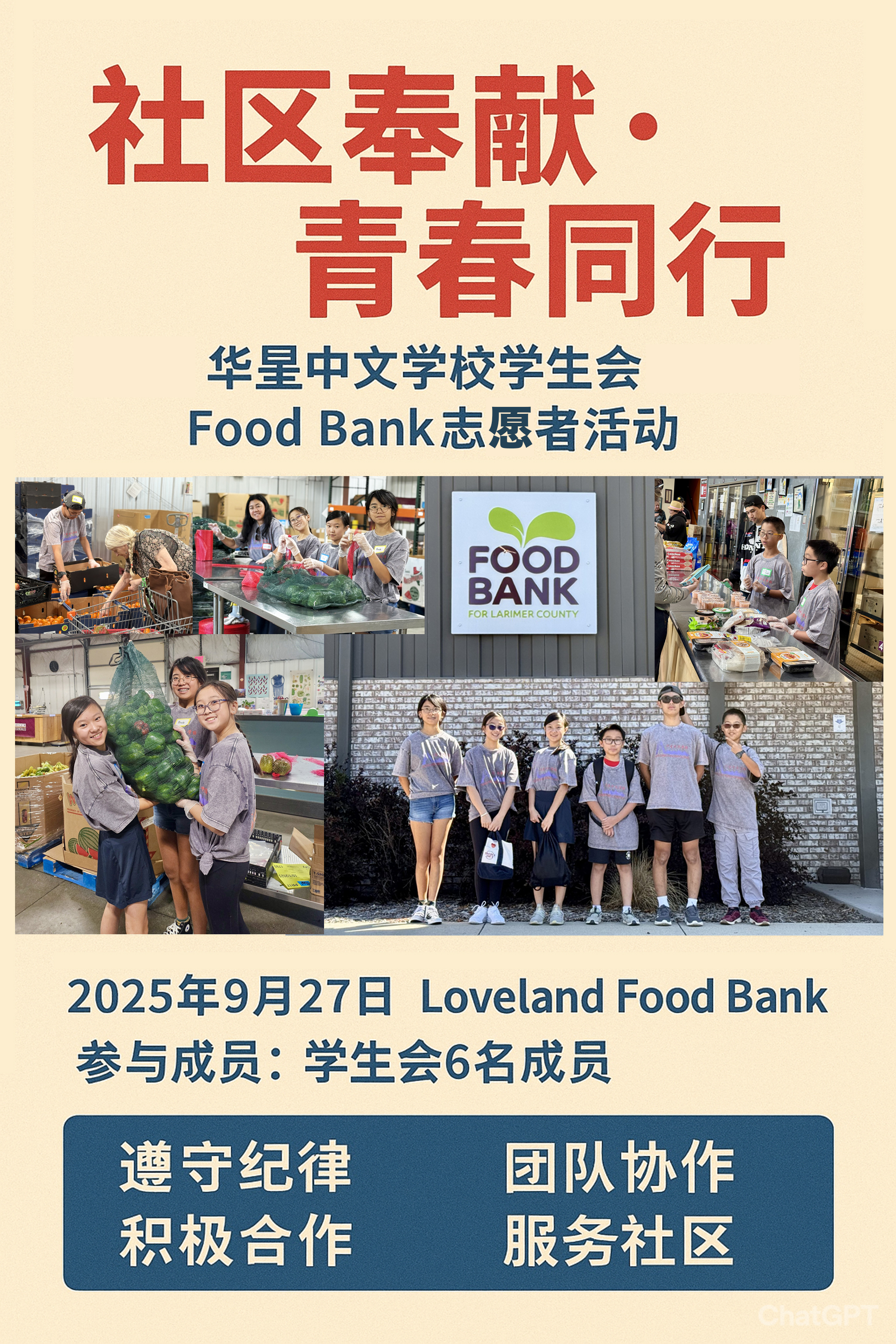 Student Council Food Bank Volunteer 2025年9月27日,华星中文学校第一批——六名学生会成员在辅导员和校长的带领下,参与了在Loveland市的Food Bank两个小时的志愿者活动。学生会成员分成男生组和女生组:男生组拆包并分发了四十多箱肉类、水果和蔬菜;女生组分装了将近两百多袋青椒。全体成员遵守纪律、团队协同、积极合作,展现了优秀的责任感和服务精神,代表华星中文学校为社区奉献了自己的力量。 Tweet Pin It